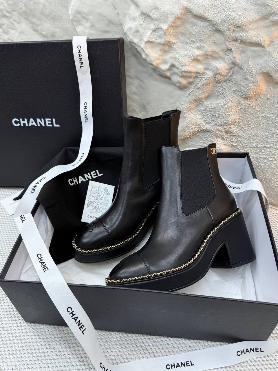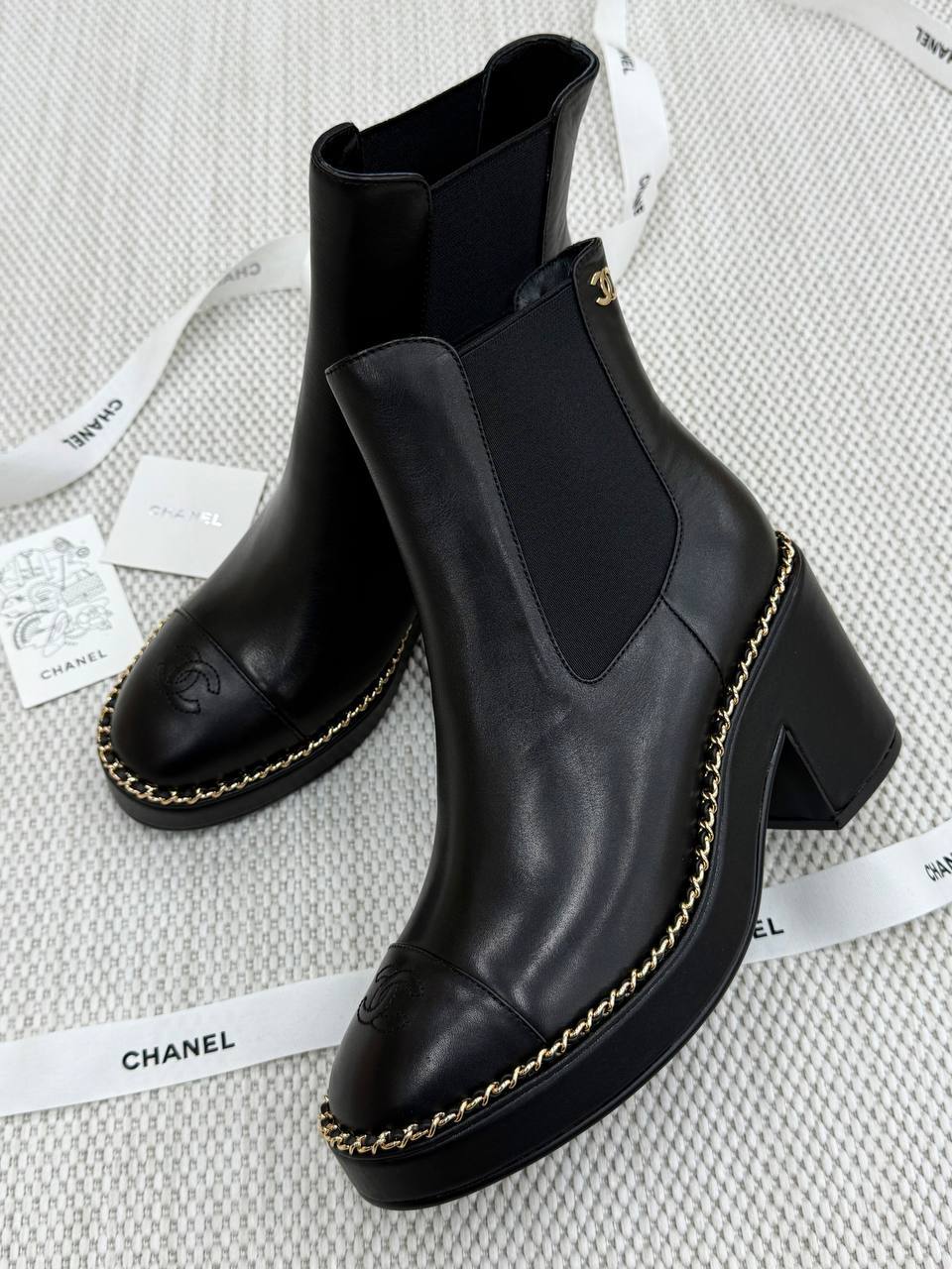 Chanel Женские Чёрные Ботинки – воплощение премиум-стиля. Массивная цепь, гладкая кожа и устойчивый каблук. Идеальный выбор для тех, кто ценит роскошь и уверенность.