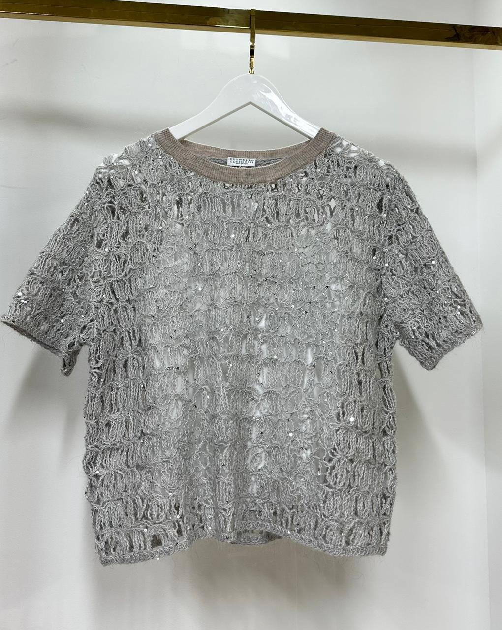 Brunello Cucinelli: Женская футболка серебряный – воплощение высокого качества и безупречного стиля. Струящийся силуэт, текстурный серый цвет и вплетенные блестки. Создайте свой элегантный образ!
