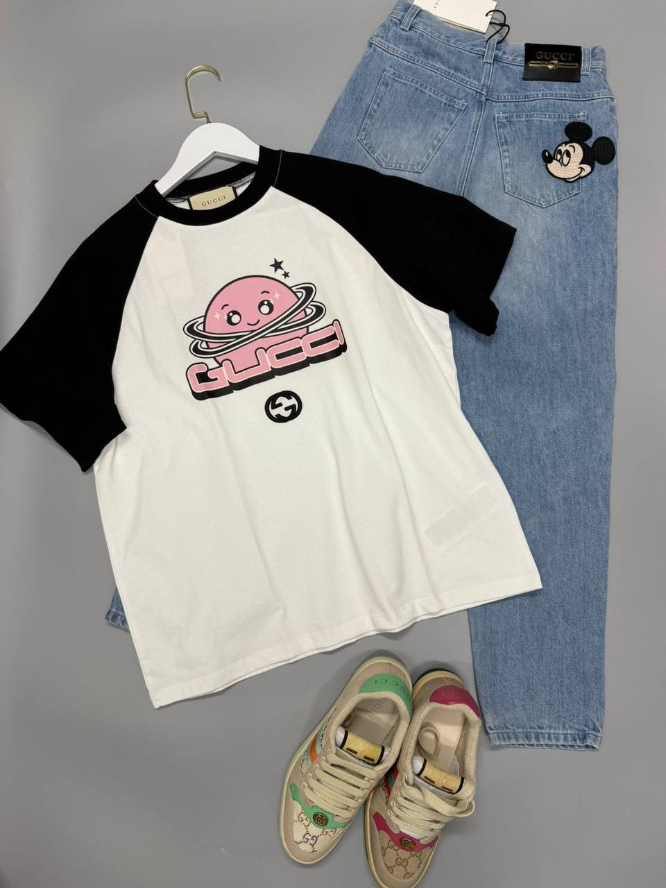 Нежная серая женская футболка Gucci с черным принтом - идеальный акцент для модной и стильной женщины.