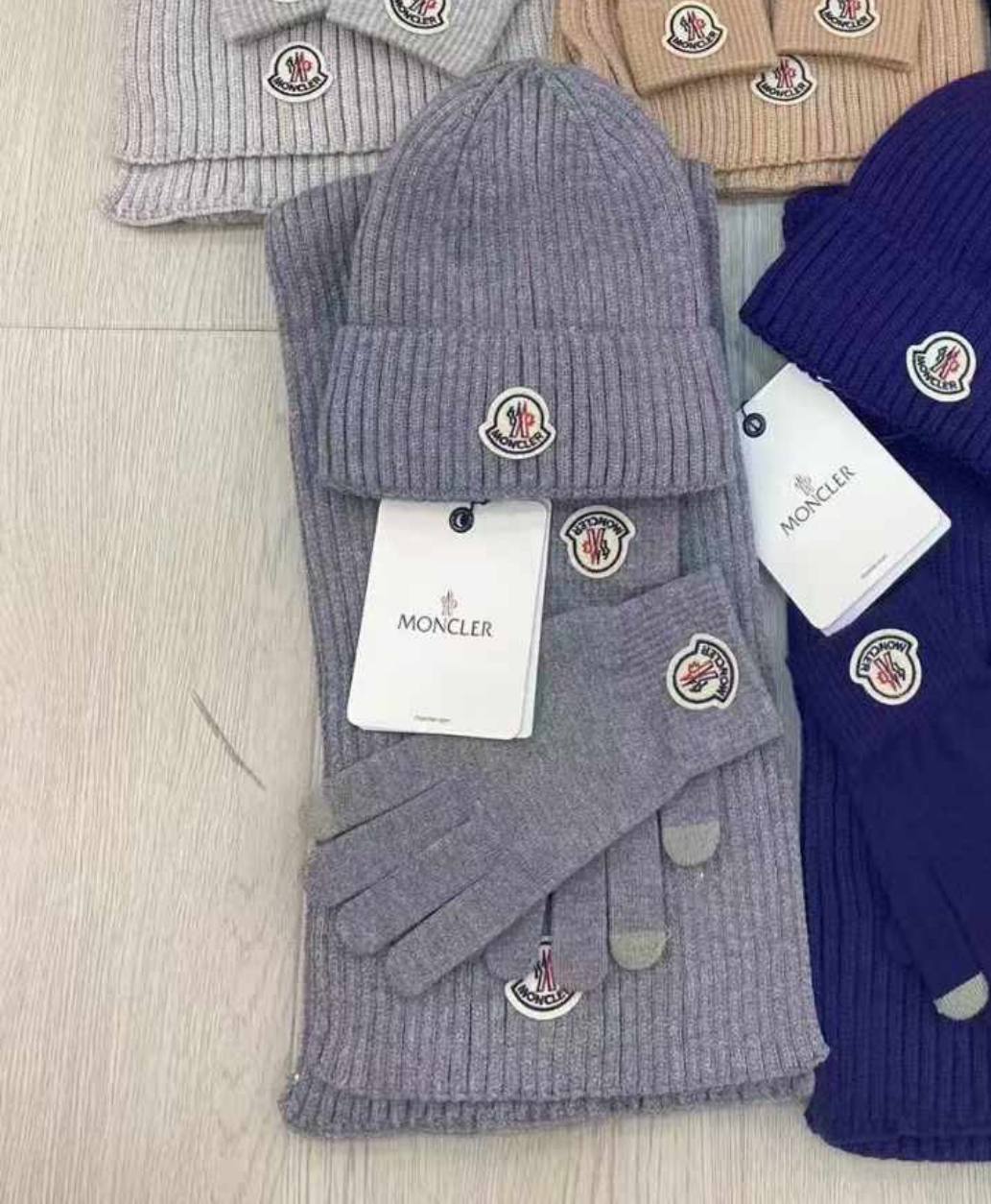 Для мужчин - шарф, шапка и перчатки Moncler серый, верхняя одежда премиум-класса.
