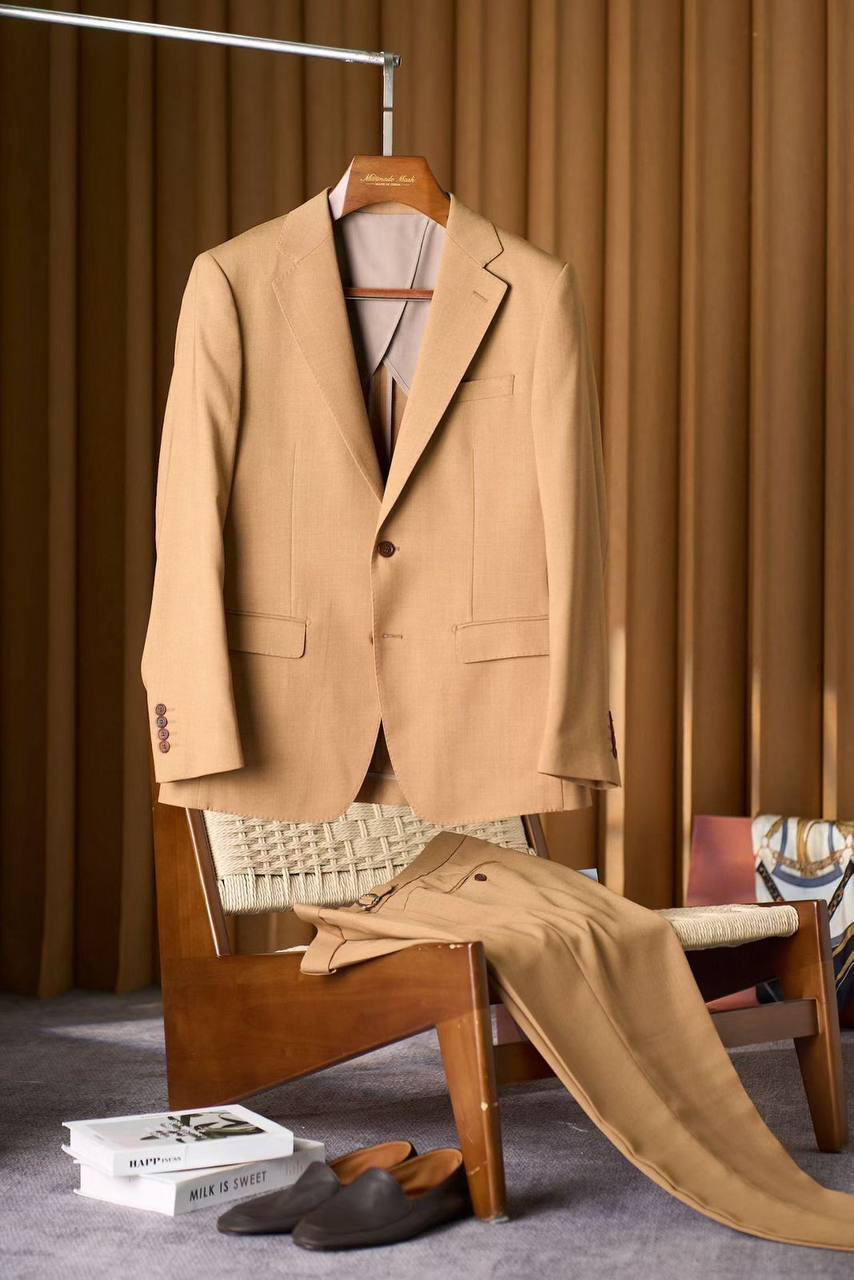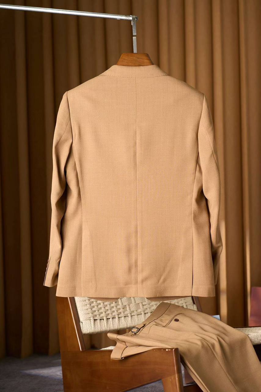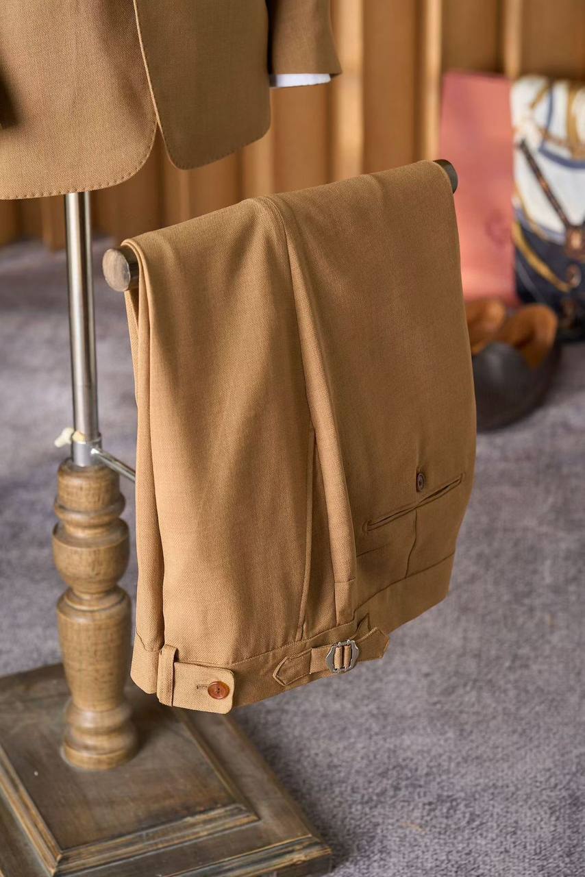 Мужской светло коричневый костюм из премиальной ткани с легким блеском. Высокое качество и безупречный крой для тех, кто ценит стиль и комфорт. Создайте элегантный образ!