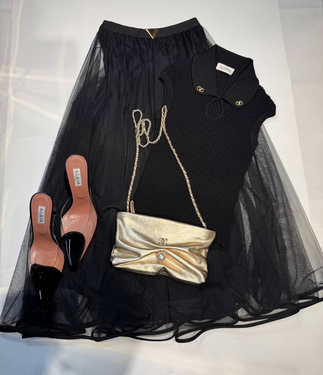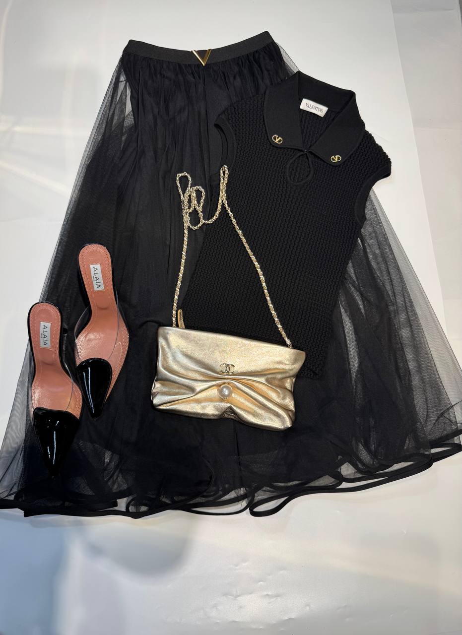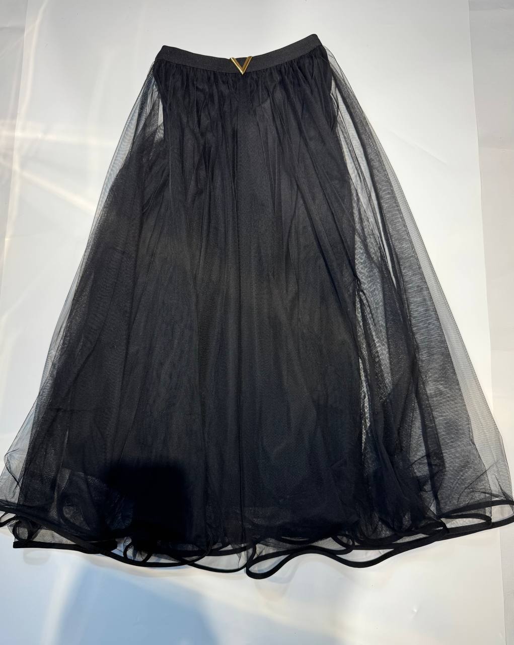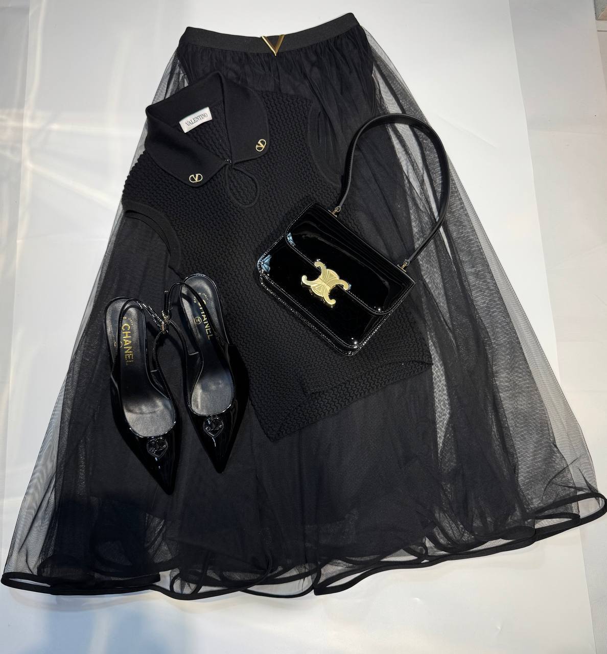 Почувствуй себя королевой! Чёрный костюм Valentino – воплощение премиум-стиля. Идеальный выбор для создания элегантного образа с полупрозрачной юбкой и эффектным поясом.