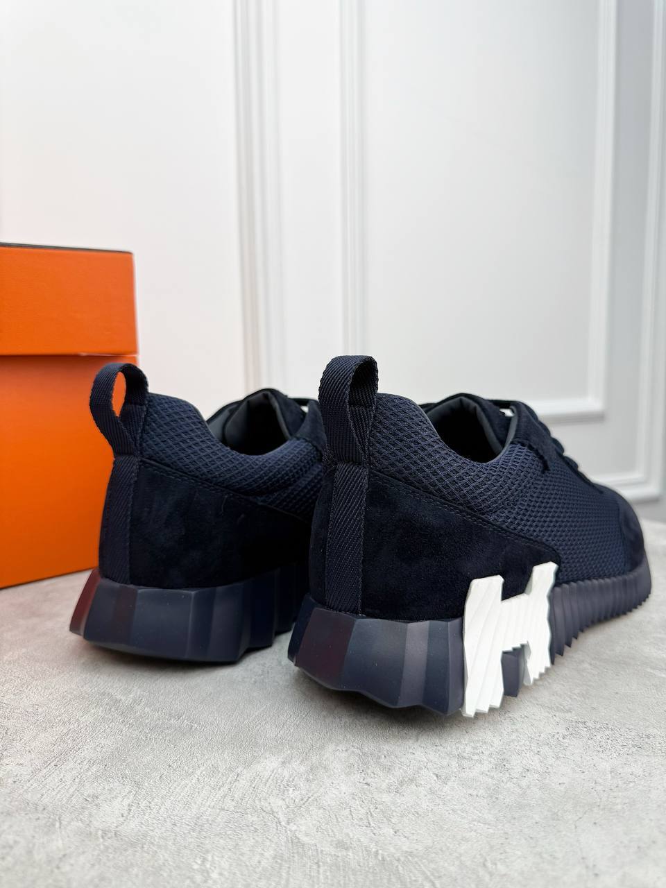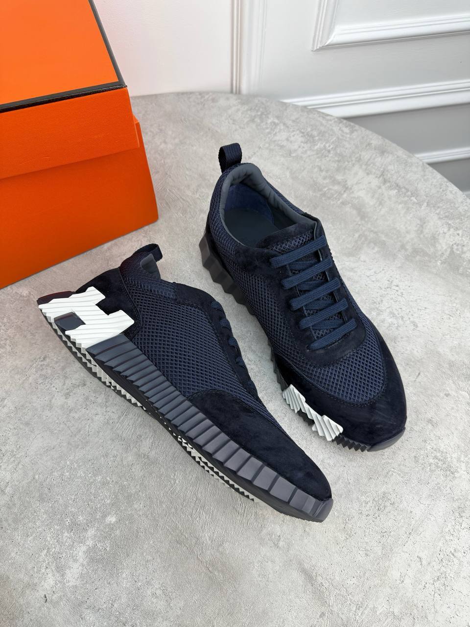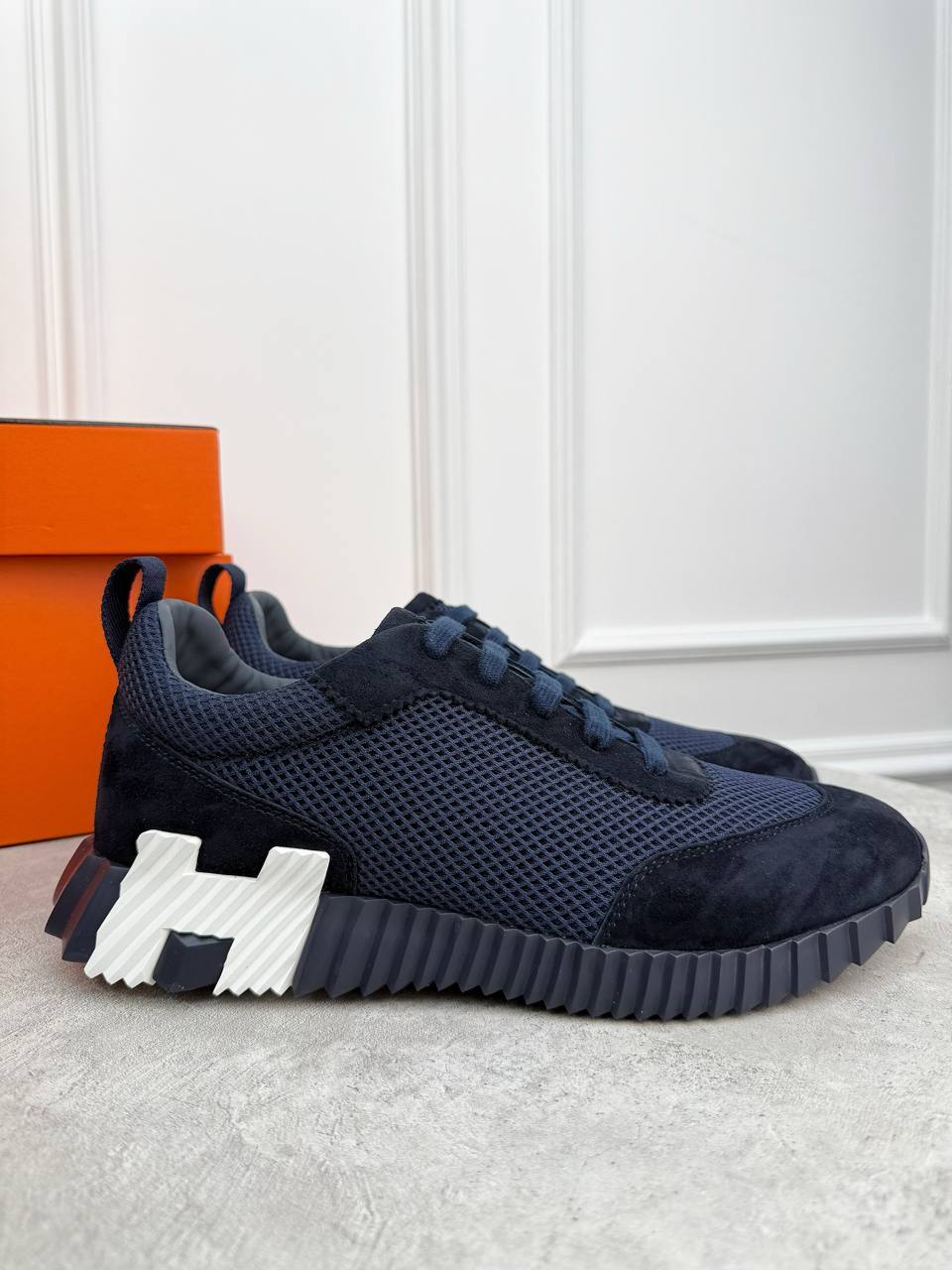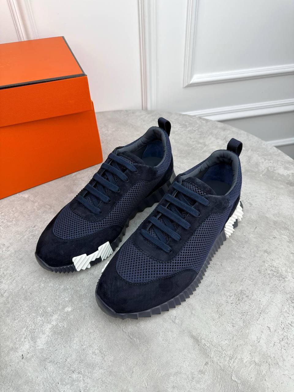 Темно-синяя мужская кроссовка от Hermès - классика высокого вкуса, достойная только настоящего гурмана.