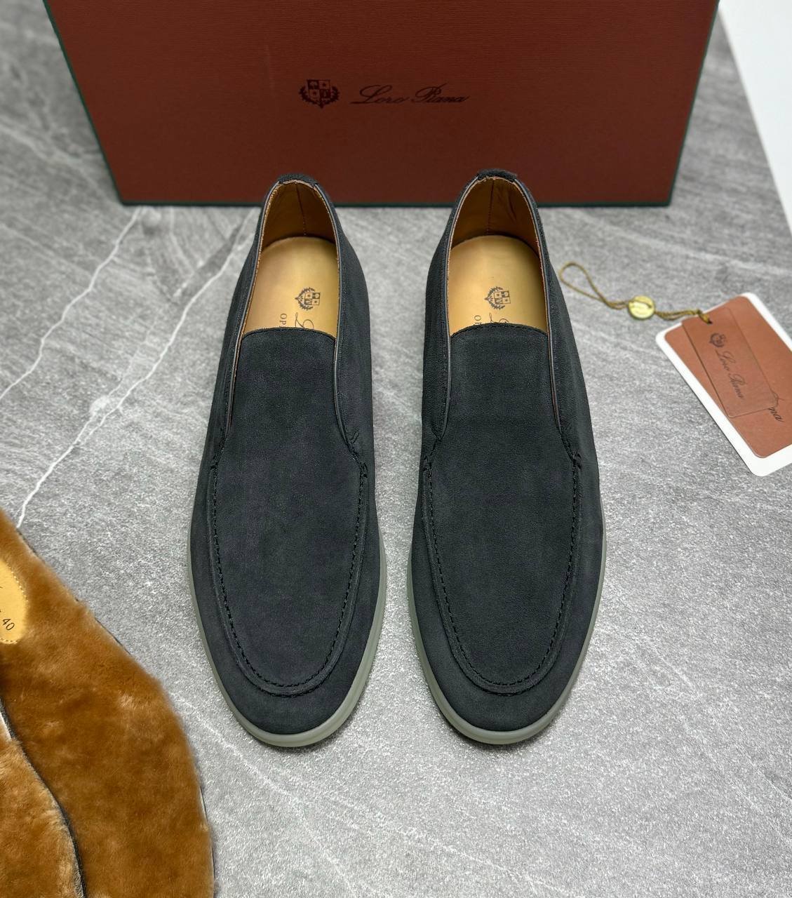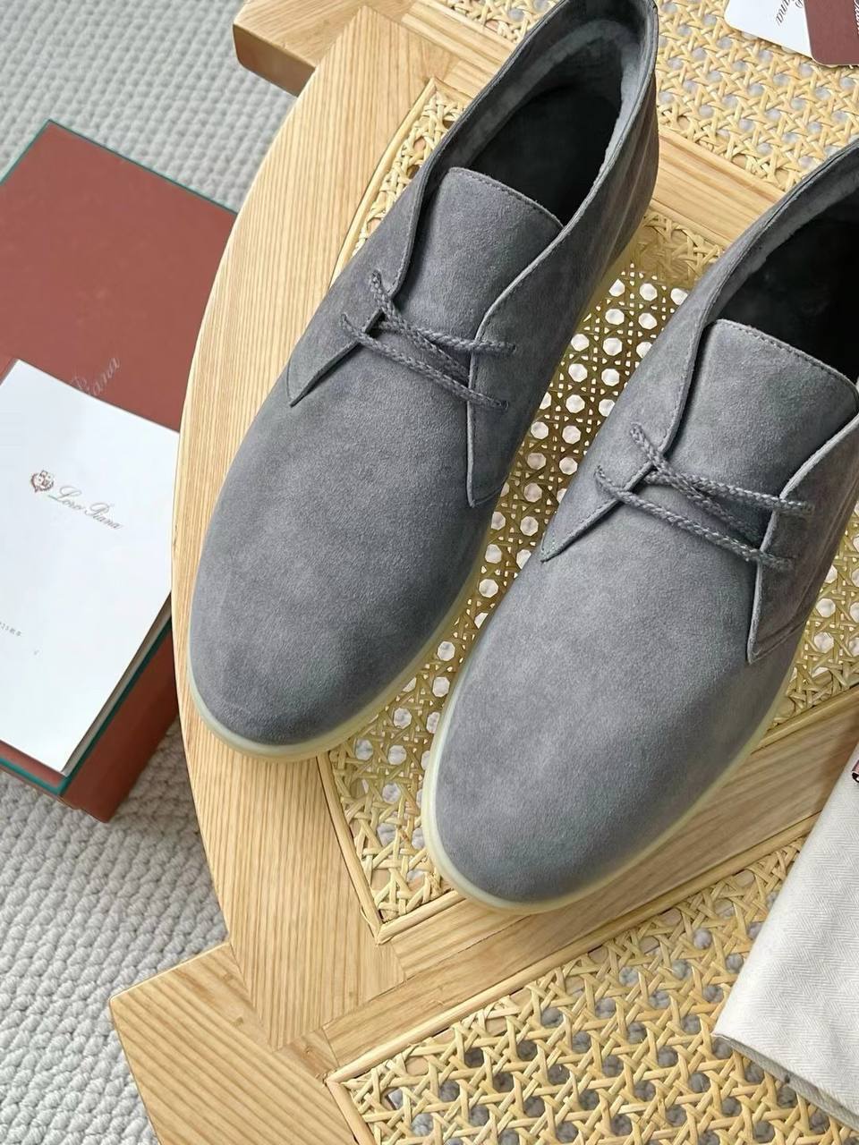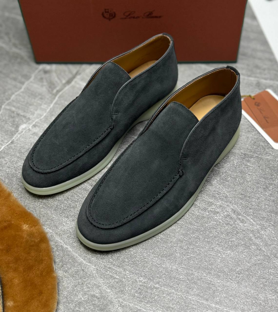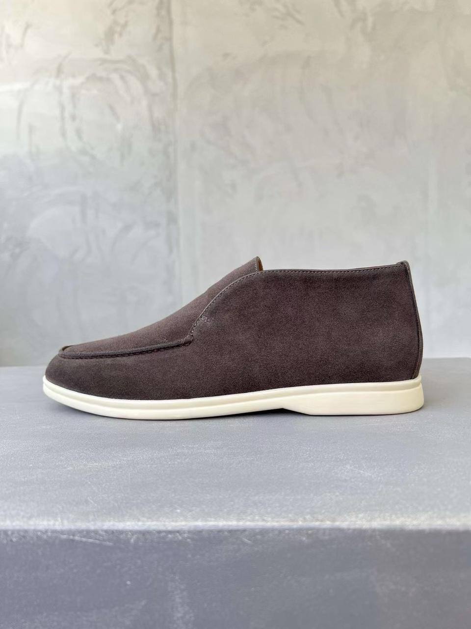 Лоферы Loro Piana серые для мужчин. Стиль: без шнурков, элегантный. Материал: кожа, цвет серый. Детали: аккуратная прострочка, эластичные вставки, белая резиновая подошва. Фасон: мокасин, комфортная посадка. Подойдут для офиса и повседневной встречи.