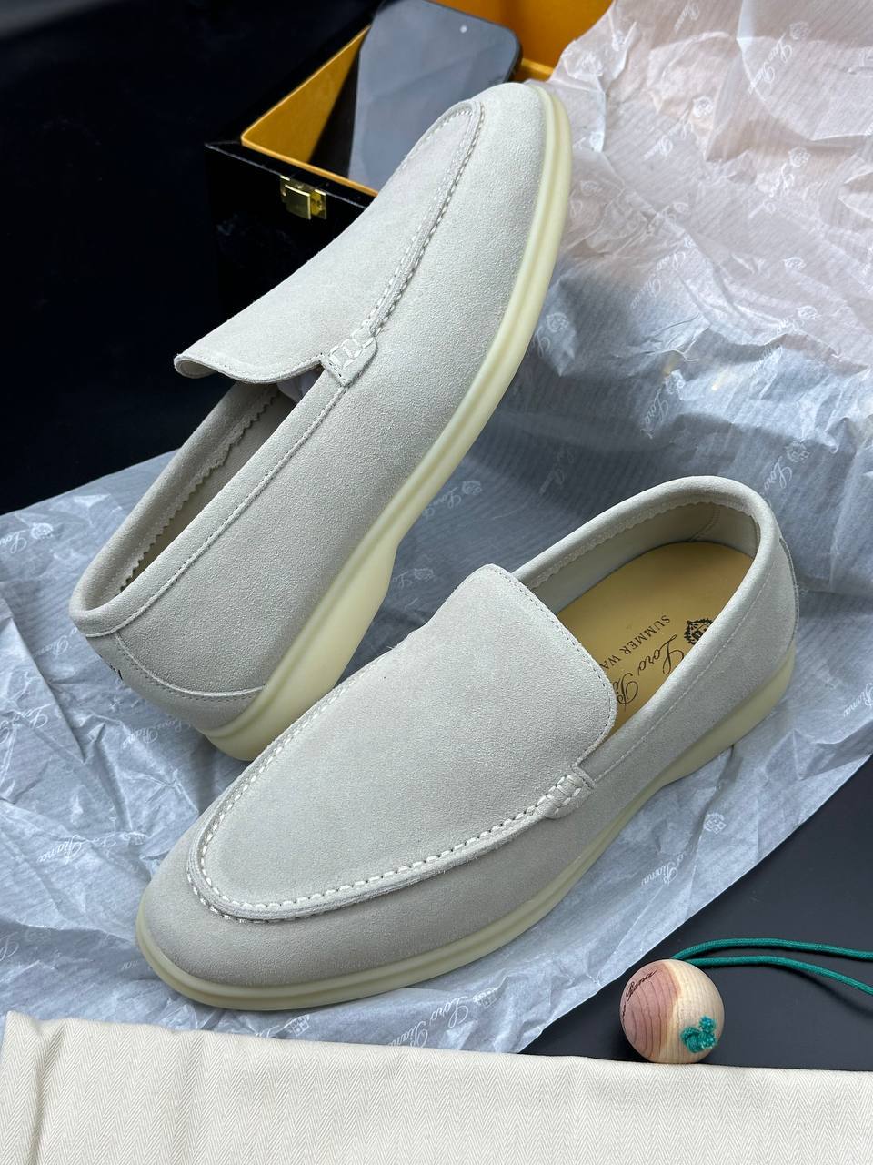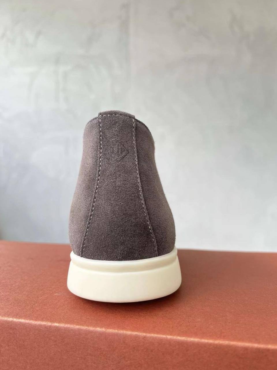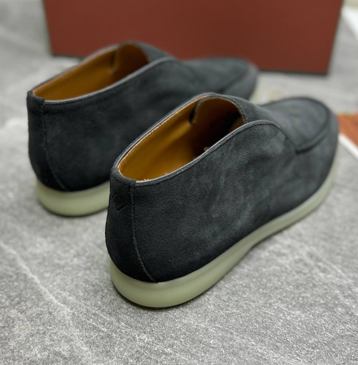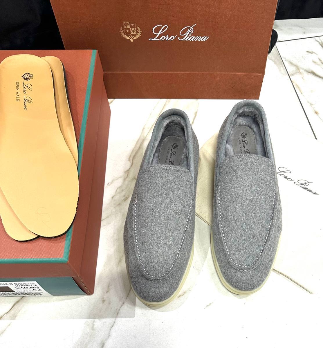 Лоферы Loro Piana серые для мужчин. Стиль: без шнурков, элегантный. Материал: кожа, цвет серый. Детали: аккуратная прострочка, эластичные вставки, белая резиновая подошва. Фасон: мокасин, комфортная посадка. Подойдут для офиса и повседневной встречи.