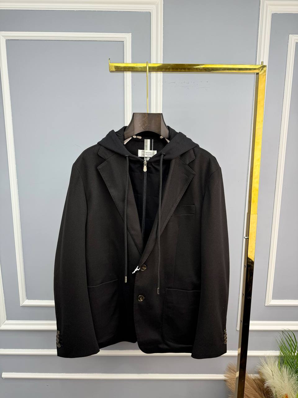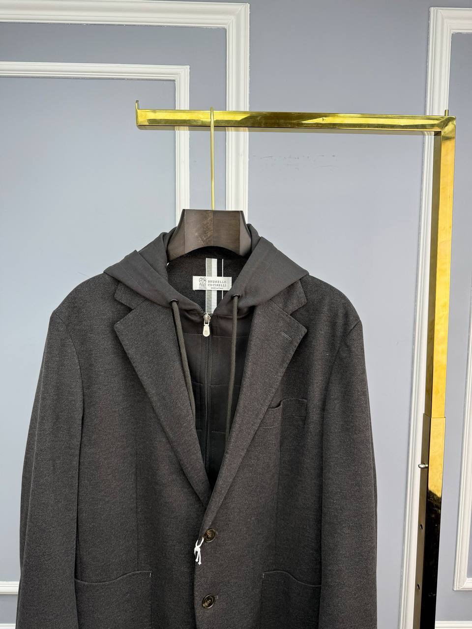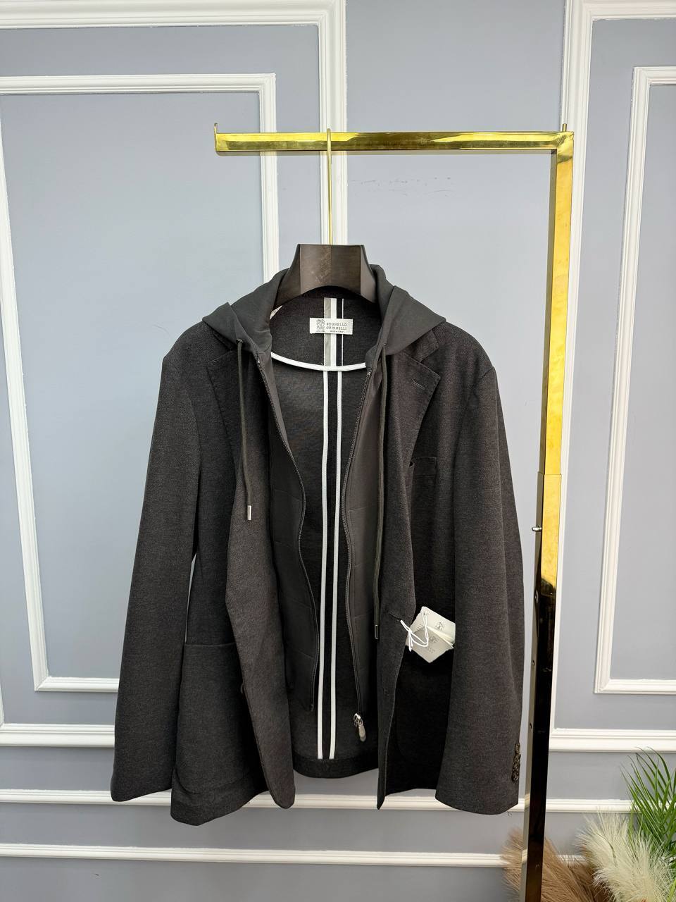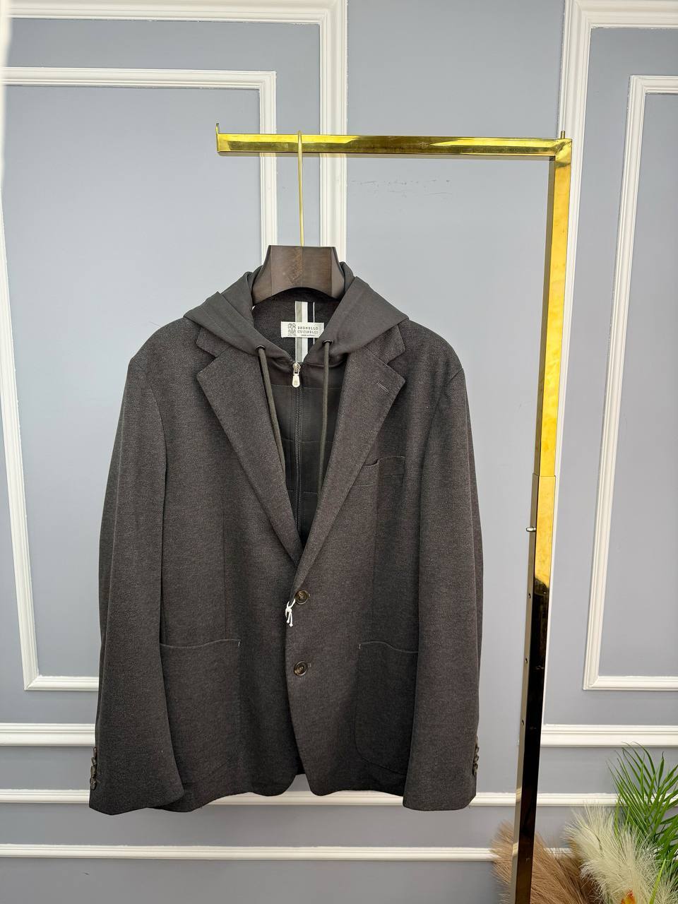 Brunello Cucinelli: темно-серый пиджак – воплощение люкс-стиля. Приталенный крой из тонкого хлопка, микромолния и пуговицы из камня. Идеальный выбор для безупречного образа.
