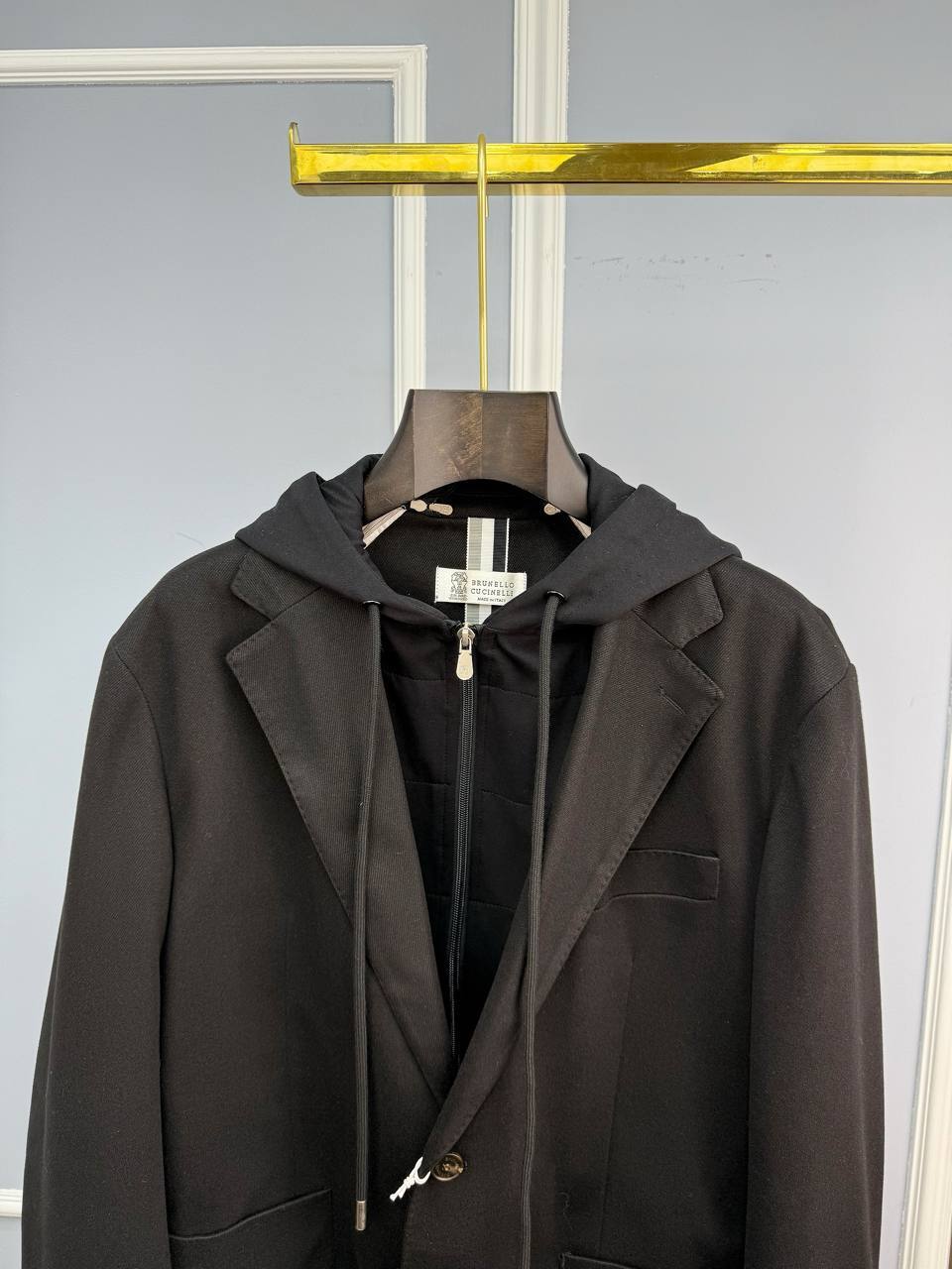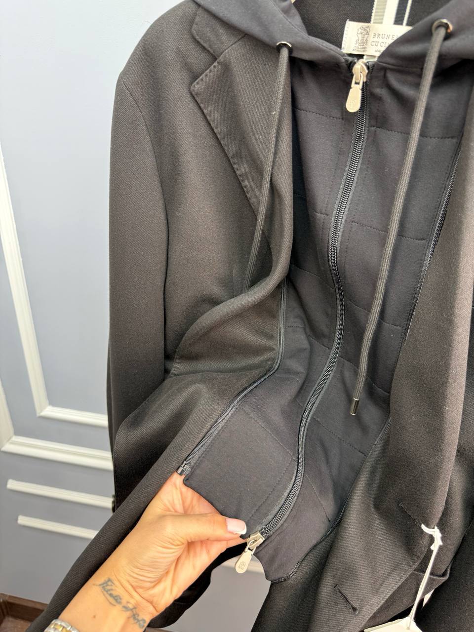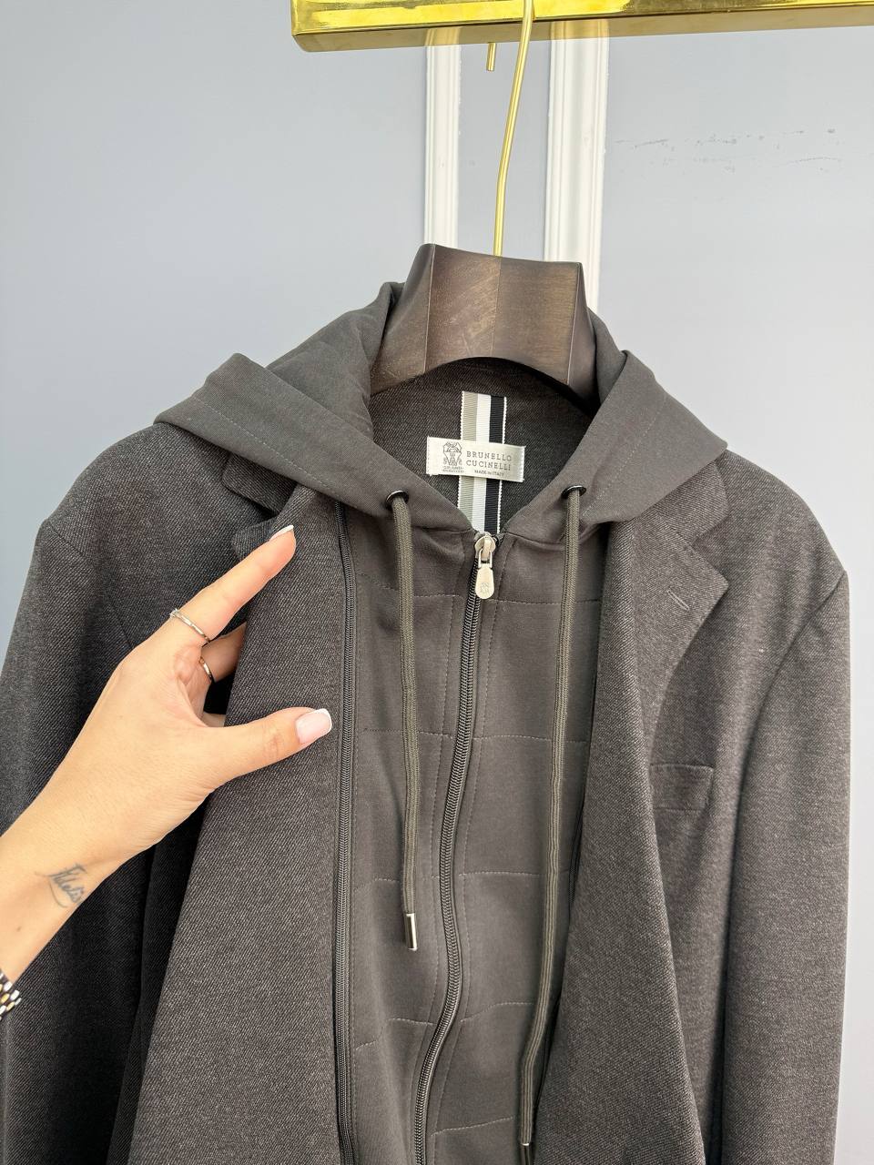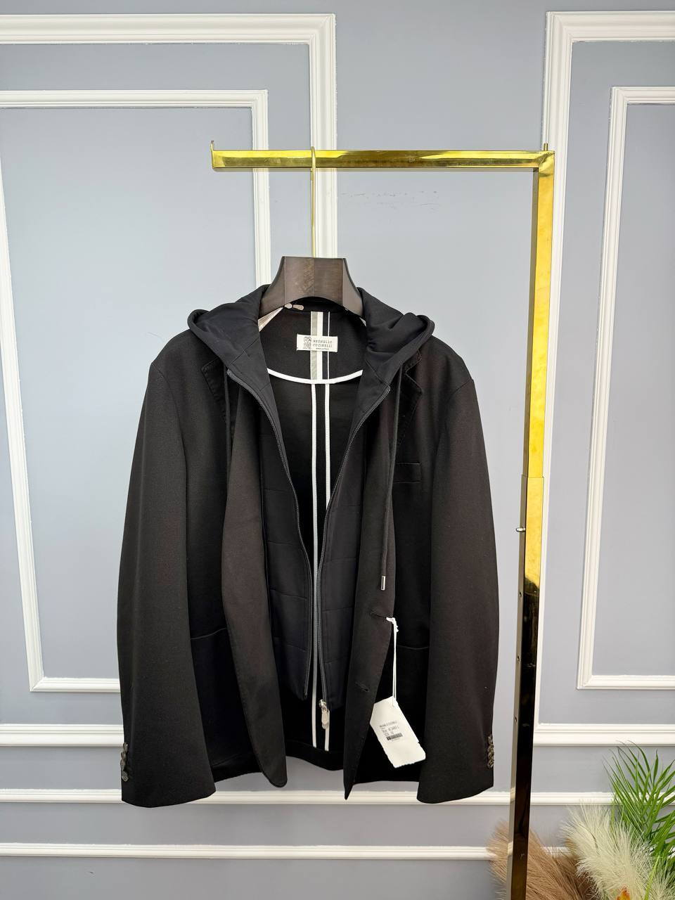 Brunello Cucinelli: темно-серый пиджак – воплощение люкс-стиля. Приталенный крой из тонкого хлопка, микромолния и пуговицы из камня. Идеальный выбор для безупречного образа.