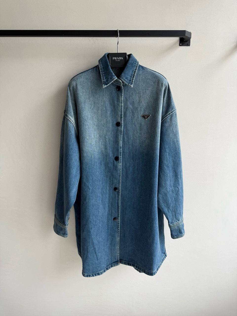 Объемная джинсовая рубашка Prada Женское Голубое Платье – воплощение высокого качества и стиля. Свободный крой, воротник-стойка и фирменный логотип. Создавайте расслабленные образы с премиальным комфортом.