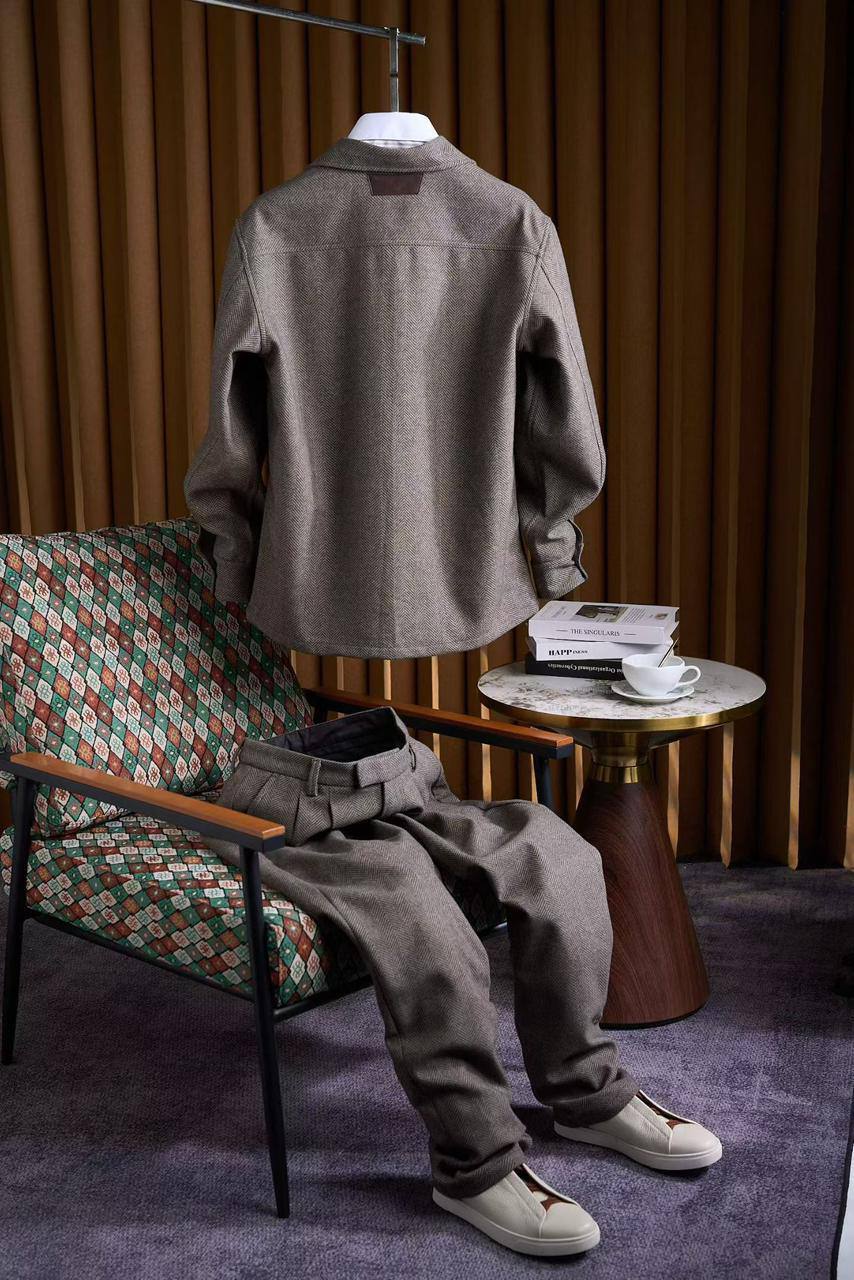 Мужской прогулочный серый костюм – воплощение безупречного стиля. Элегантный силуэт из плотной шерсти и расслабленный крой создают образ в стиле люкс. Идеально для тех, кто ценит комфорт и вневременную классику.