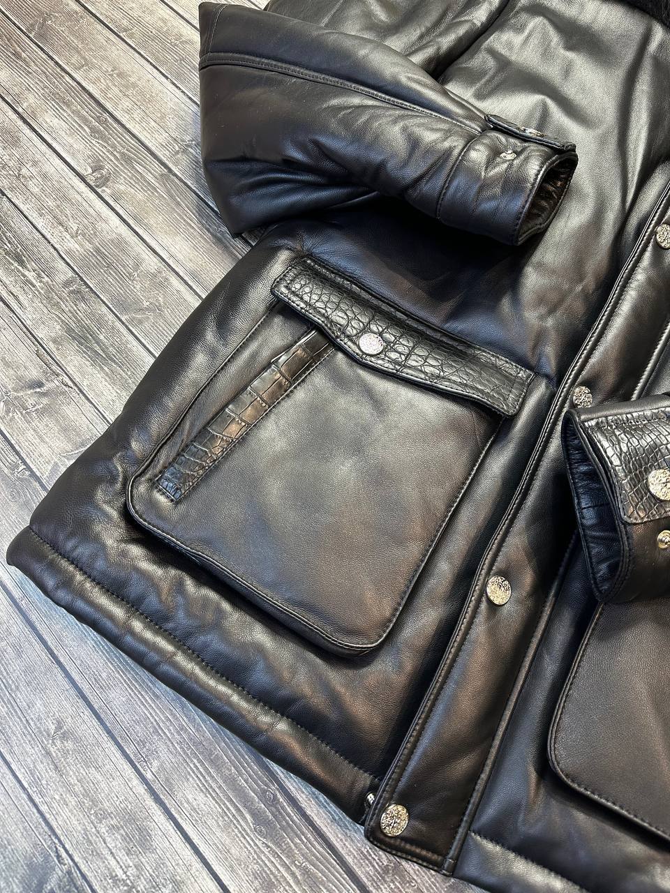 Для мужчины с элегантным вкусом - черный пуховик Stefano Ricci с эксклюзивной вставкой крокодильской кожи, гарантирующий непревзойденное высокое качество и стиль.