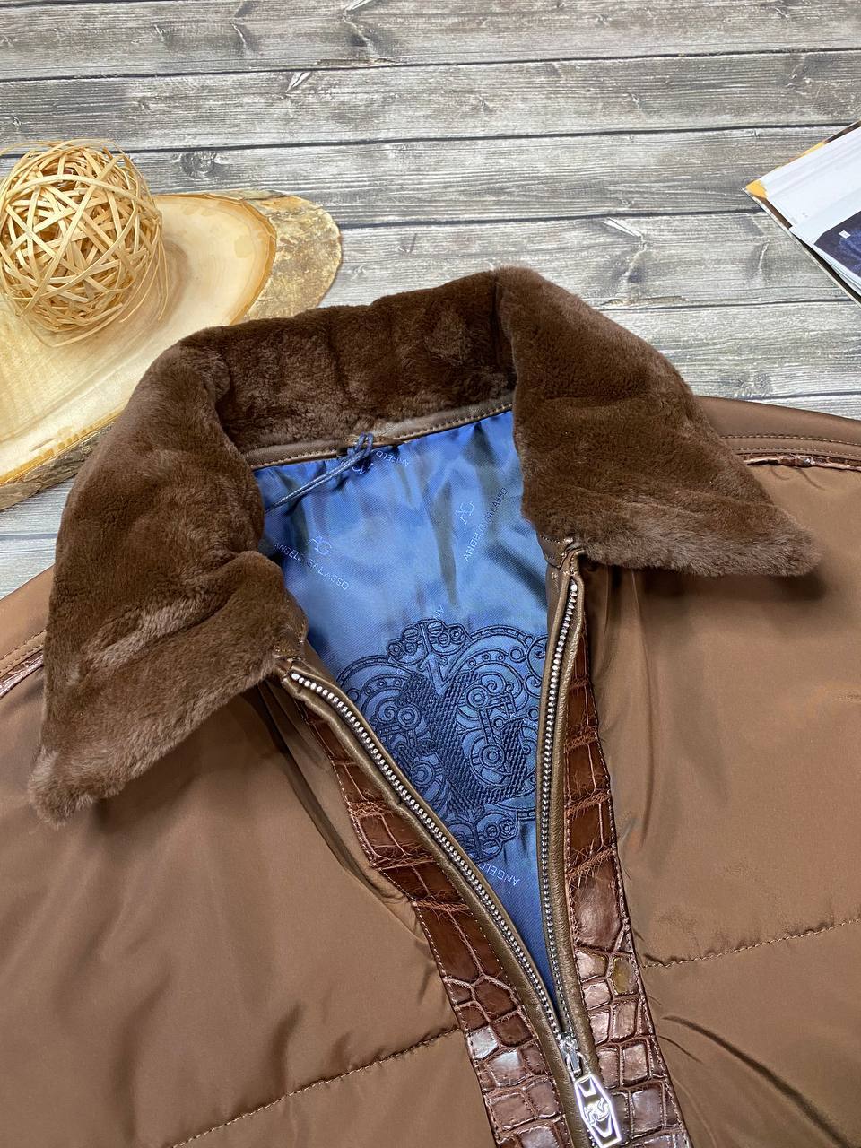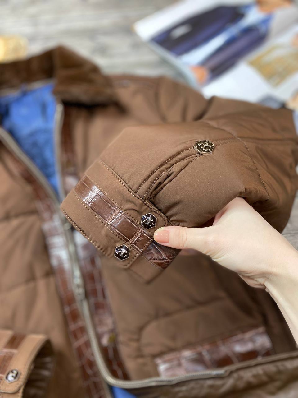 Для мужчины с чувством стиля - коричневый пуховик Angelo Galasso из кожи крокодила, идеальный выбор для холодных дней.