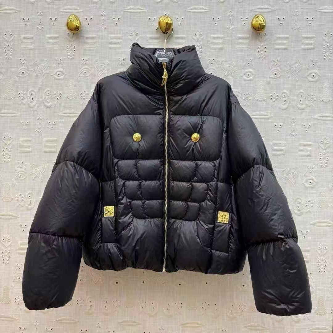 Стильный чёрный пуховик Schiaparelli – воплощение роскоши и комфорта. Отличное качество, объемный крой, высокие воротники и золотые пуговицы. Идеальный выбор для уверенных в себе женщин.