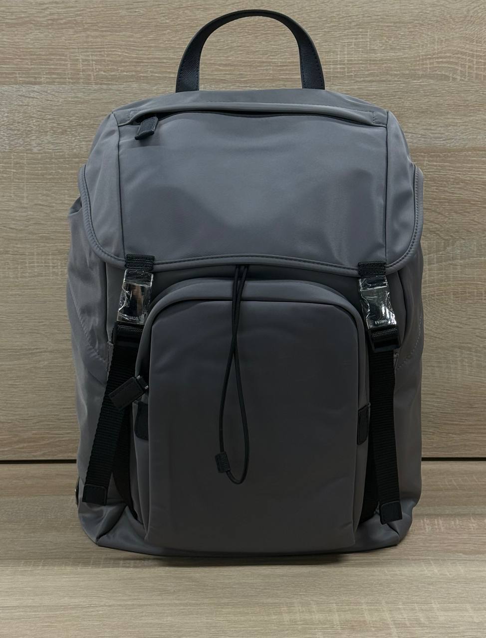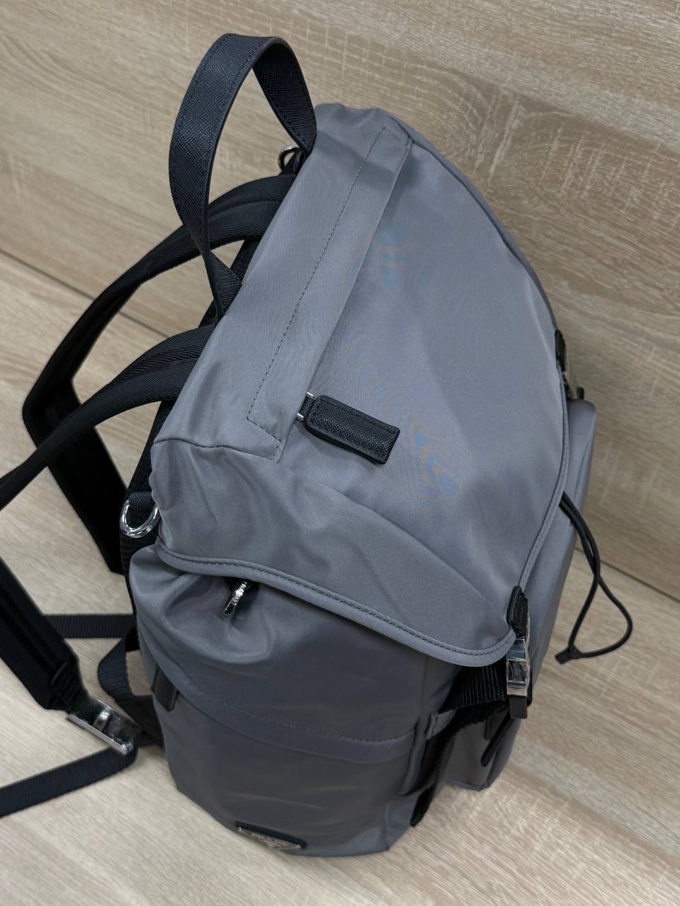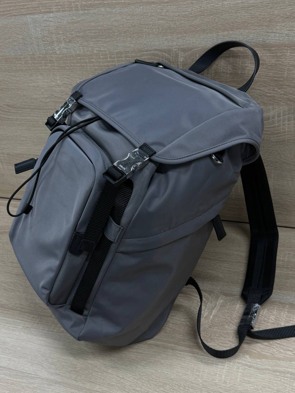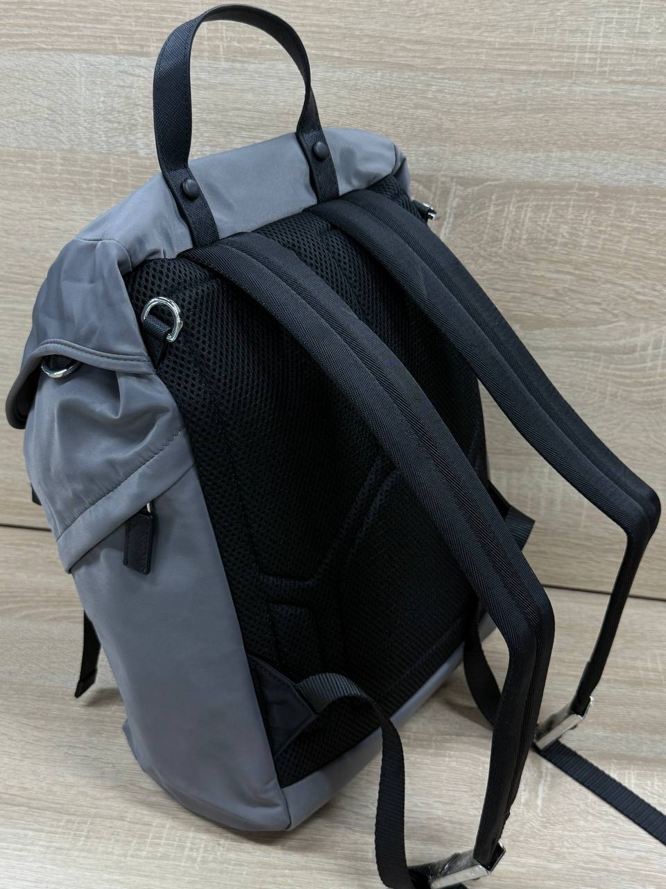 Для дельцов и ценителей стиля - мужской рюкзак Prada серый размер 30х44х23, созданный для тех, кто не уступает в эстетике и комфорте.