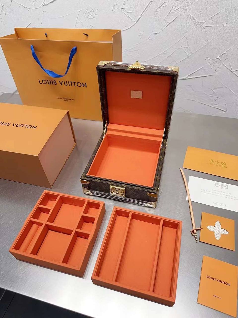 Элегантная мужская шкатулка Louis Vuitton, красный цвет на сером фоне, размер 38,5х16х18,5 см, классика премиум-класса для настоящего джентльмена.