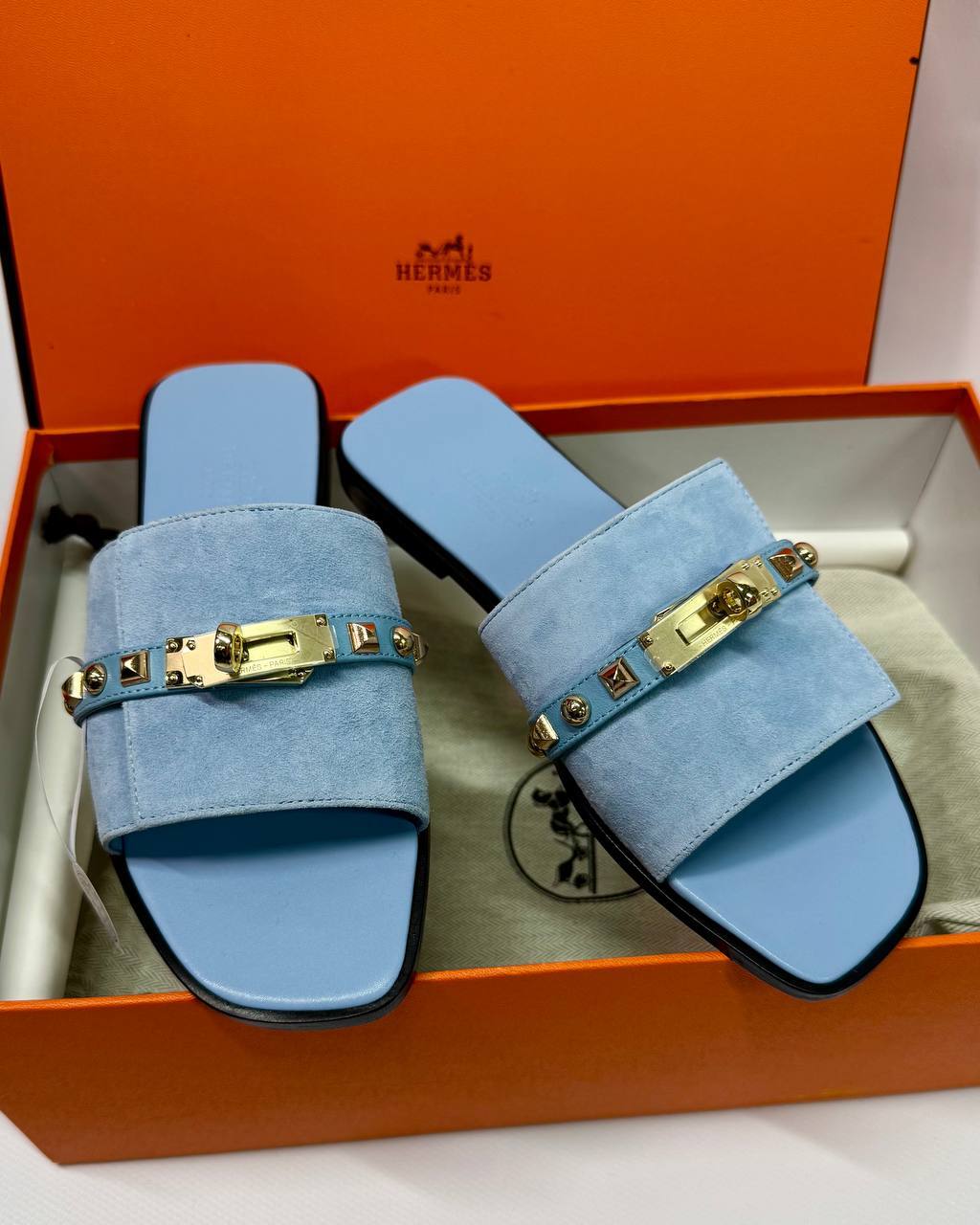 Для элегантных дам - Женские шлепанцы Hermes голубые. Классика высокой моды в новом цвете.