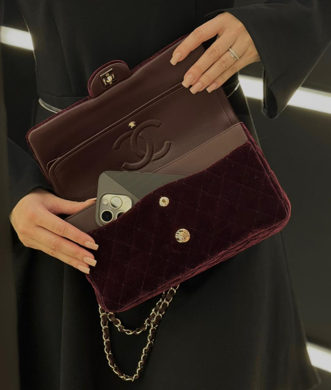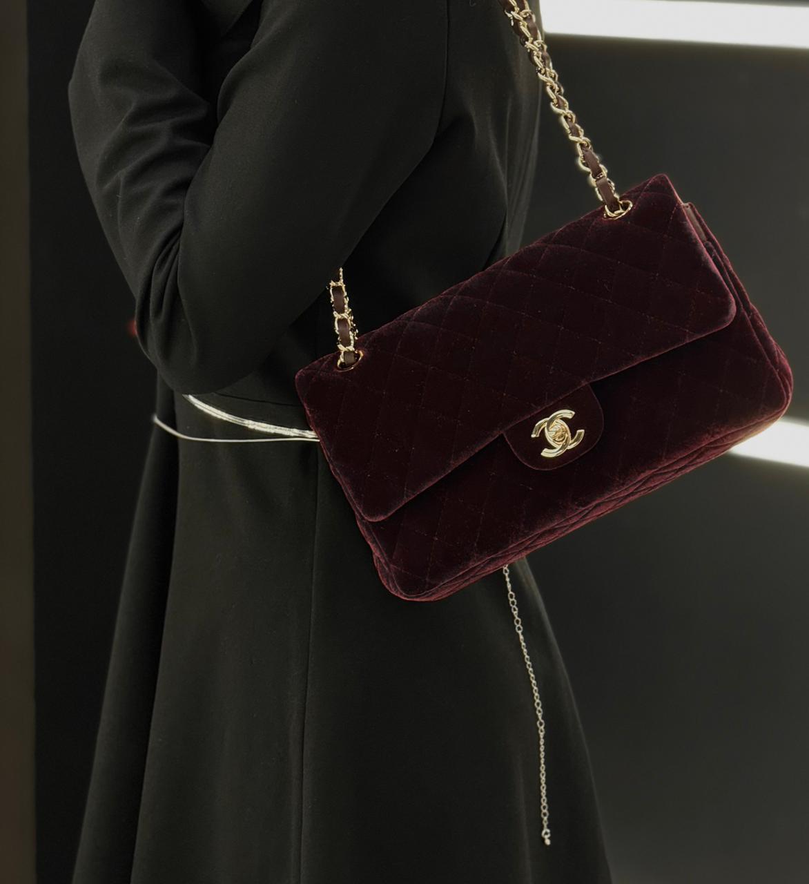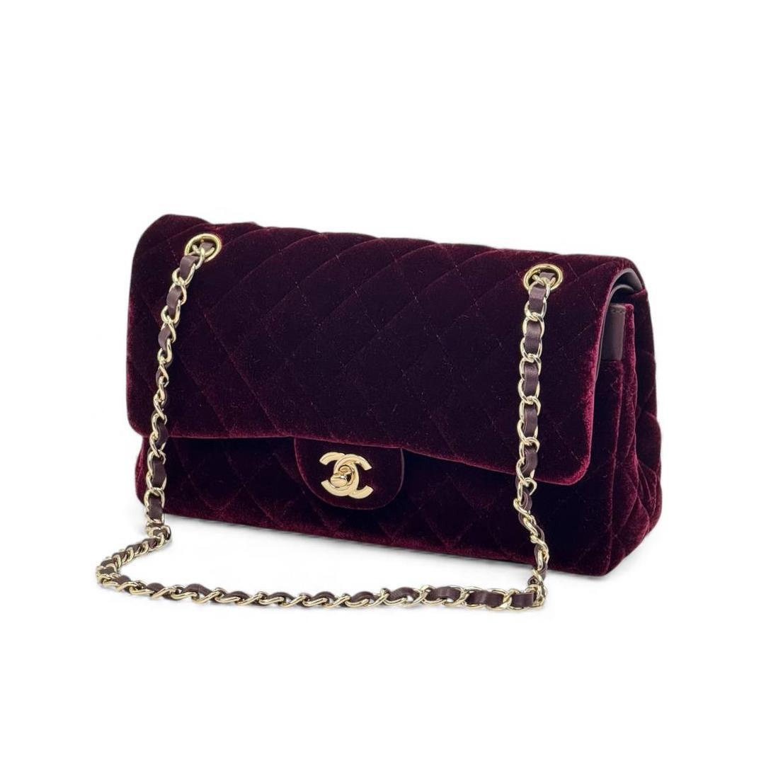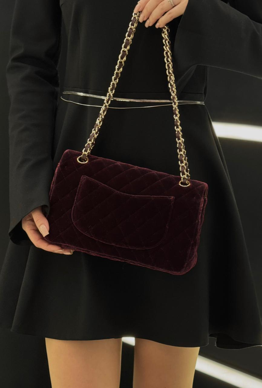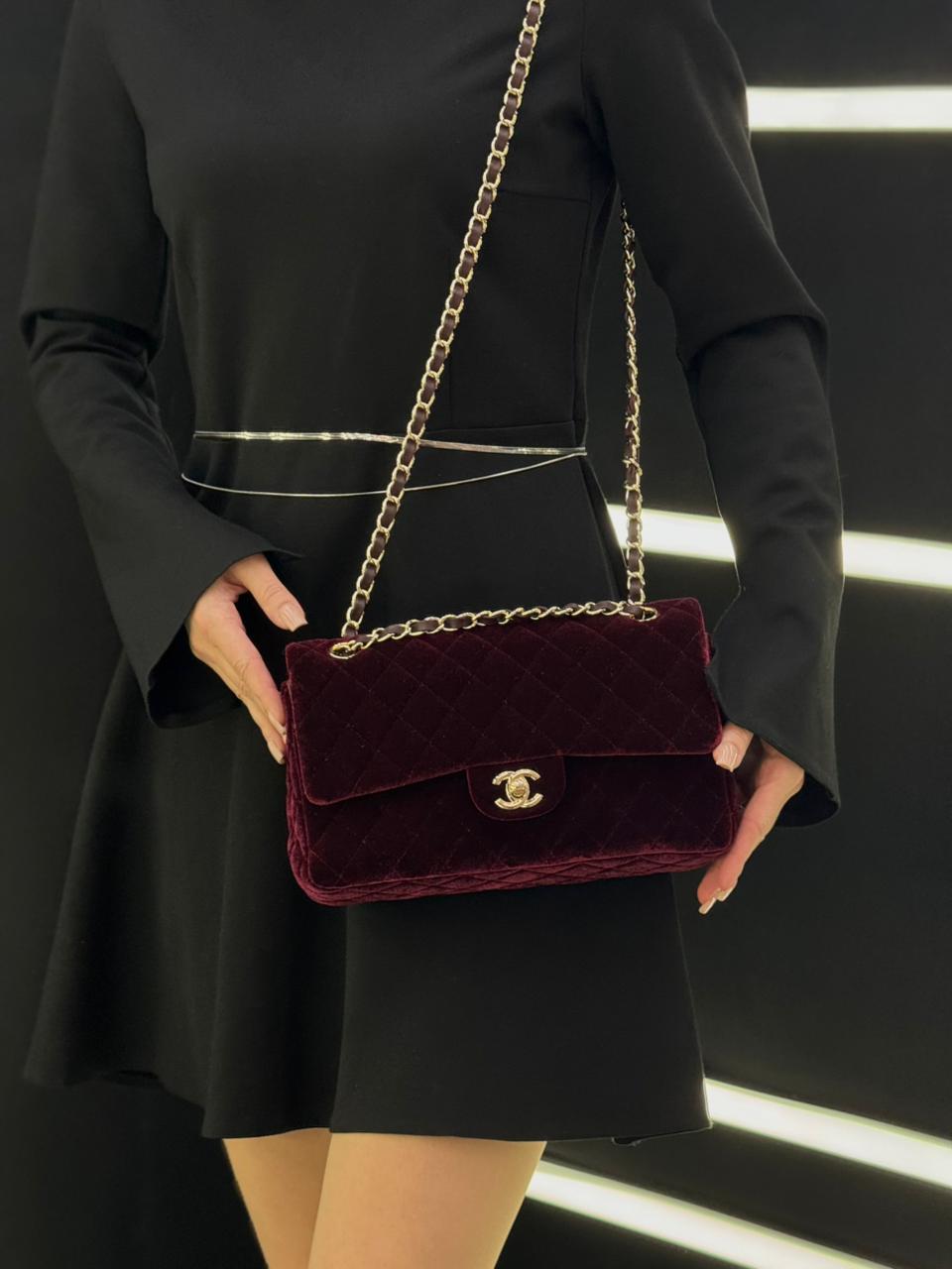CHANEL Женская Бордовая сумка 25 см – воплощение лаконичного шика. Роскошный бархат, золотая цепь и узнаваемый логотип. Создайте свой безупречный образ с этой культовой сумкой.