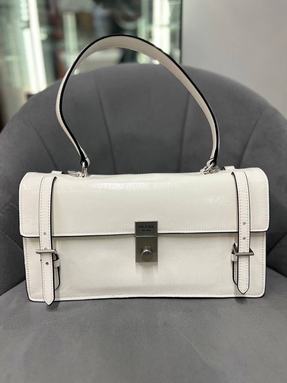 Белая женская сумка Prada класса Люкс, размер 32х16,5 см - идеальный аксессуар для модной и стильной женщины.