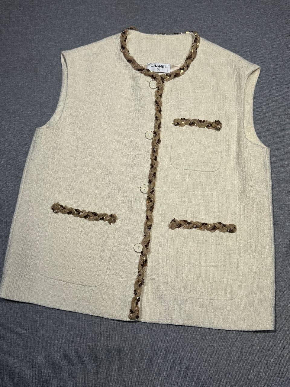 Почувствуйте роскошь с Женским жилетом CHANEL Белый из тонкого жаккарда. Изысканный дизайн, золотая вышивка и безупречный стиль – воплощение люкс. Добавьте элегантности в свой гардероб!